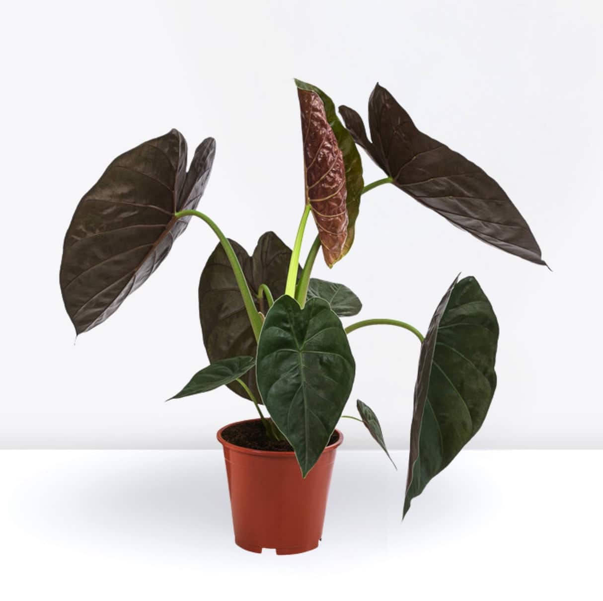 The Alocasia Wentii has beautiful heart-shaped, glossy green leaves with prominent veins and a contrasting metallic maroon reverse. The richly textured leaves are complimented by tall graceful stems which further add to its overall elegant charm.