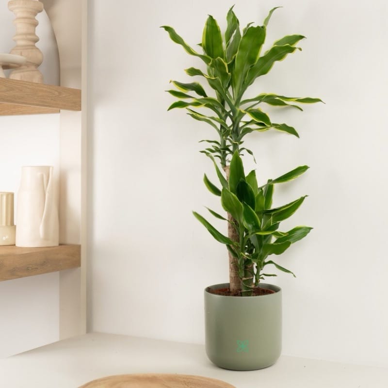 A broad-leaf Dracaena with a pop of feel-good colour. The lush green leaves are bordered by a striking yellow margin, ideal for combining with the yellow borders of a Sansevieria trifasciata Laurentii for a totally tropical indoor vibe.