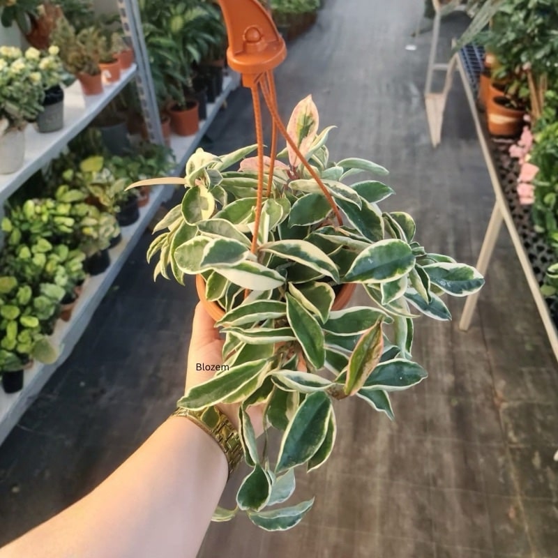 Hoya carnosa ‘Krimson Queen’ is a strikingly elegant plant known for its glossy, wax-like leaves edged in creamy white and soft pink. New growth often emerges in vivid shades of blush, adding a delicate contrast to the rich green centers of mature foliage. Its long, trailing vines create a graceful, cascading form that enhances its ornamental appeal. When grown in bright light, the plant becomes even more vibrant, sometimes producing clusters of star-shaped, porcelain-like flowers with a sweet, subtle fragrance. Altogether, the ‘Krimson Queen’ embodies a blend of tropical beauty and refined variegation that makes it a standout among houseplants.