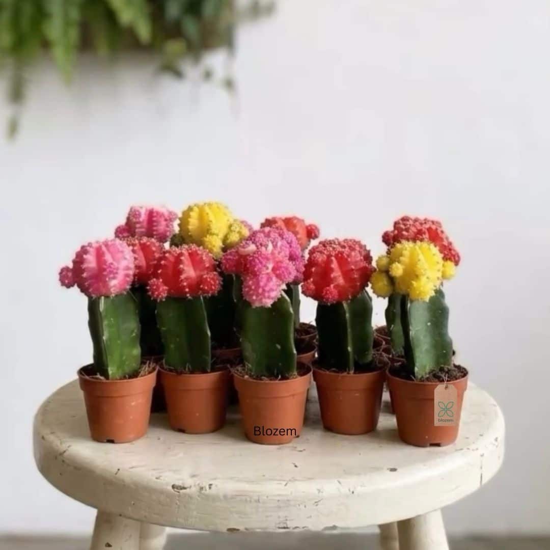 Moon cactus plants come in vibrant bright colors of hot pink, brilliant orange and even an almost neon yellow. These are small plants, generally only a half inch across, although there are cultivars that get up to 8 inches in diameter.