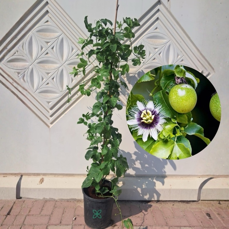 The passion fruit plant is a fast-growing, evergreen vine known for its exotic, fragrant flowers and delicious, nutrient-rich fruit. The plant can climb rapidly using its tendrils and can reach over 15–20 feet (4.5–6 meters) in a single growing season. The flowers are typically white and purple, highly ornamental, and are followed by round or oval fruits. The fruit’s outer skin can be purple or yellow, and the inside contains aromatic orange pulp filled with black seeds.