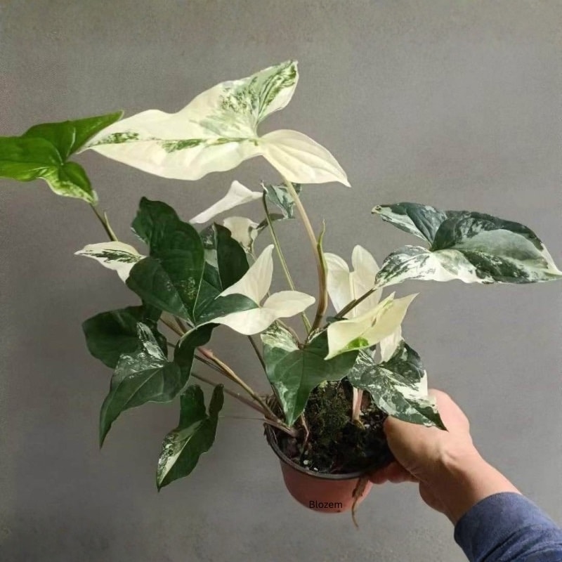 Syngonium podophyllum ‘Albo Variegatum’ is a stunning ornamental plant admired for its unique and unpredictable variegation. Its arrow-shaped leaves feature striking patterns of creamy white and deep green, with each leaf displaying a one-of-a-kind design that feels naturally artistic. The bright variegation gives the plant a fresh, elegant appearance, while its trailing or climbing growth habit adds softness and movement to any indoor space. Both rare and eye-catching, this plant brings a sense of natural beauty and refined charm wherever it is displayed.