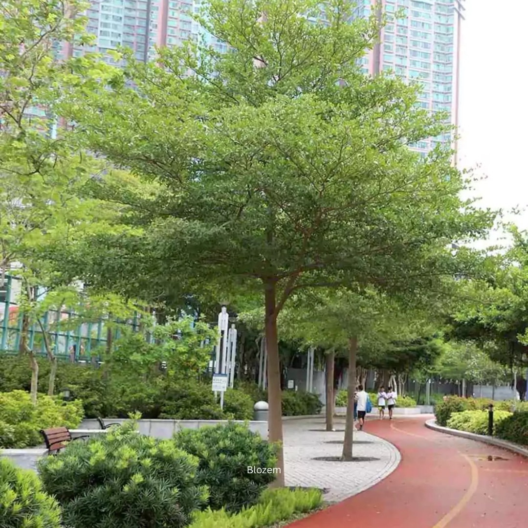 Terminalia mantaly, the Green Madagascar Almond, is admired for its elegant, architectural beauty, with branches arranged in graceful horizontal layers that form a naturally symmetrical, umbrella-like canopy. Its small, glossy green leaves cluster neatly along the branch tips, creating a fresh, vibrant appearance throughout the year. The tree’s balanced shape and tiered form give it a calm, refined presence, making it a standout ornamental tree that brings both shade and visual harmony to landscapes, gardens, and avenues.